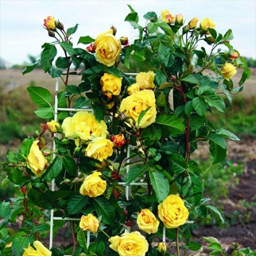 Гүлдөрү чоң, 10-11 см, толук ачылганда эң жакшы көрүнөт, майда ток сары ички желекчелери сырттагы ачык сары чоң желекчелери менен контраст түзөт. Гүлдөр адатта жалгыз пайда болот, чай-гибриддүү розалар сыяктуу, биринчи гүлдөгөндө,кайрадан гүлдөсө топ-топ менен, Флорибунт сыяктуу. Аромат абдан жыпар жыттуу,жемиш жыттанат. Бою түз, кышка туруштук берген, чоң жалтырак жапырактары менен, 3-4 м жогорку жетет. Бутондор узун-мурундалган. Түсү лимондуу-сары, кооз бокал формасында, чоң 8-9 см.Жапырактар кенен, борборго жакындап кыскартылган, жалгыз же 3-5 кичинекей гүл чөйчөк түрүндө. Жалпырактары кулпурган ток жашыл түстө. Бою 2 метрден жогору .Улам кайталанып көп гүлдөйт.