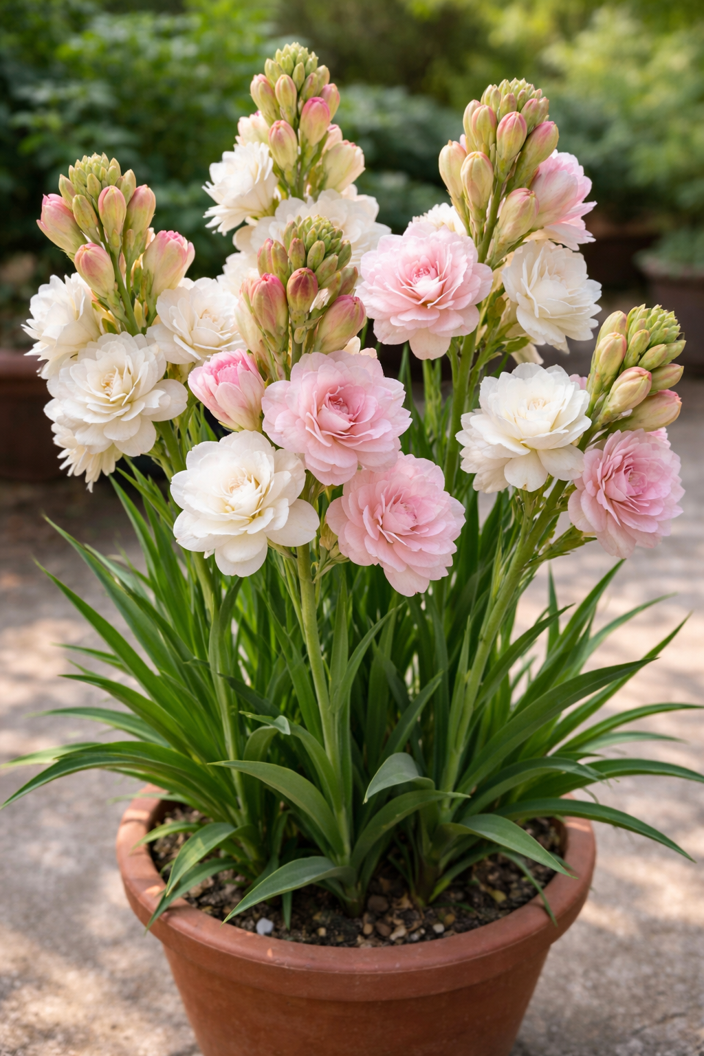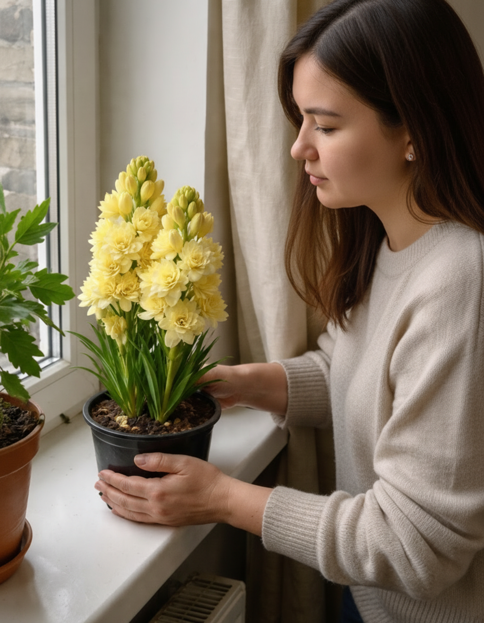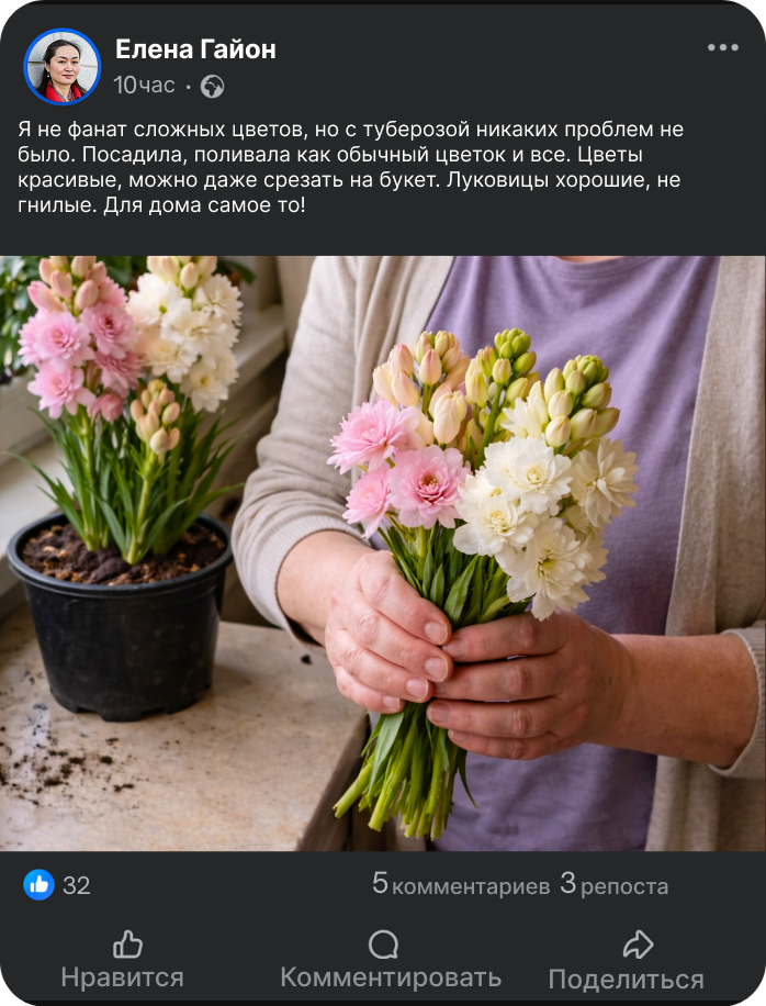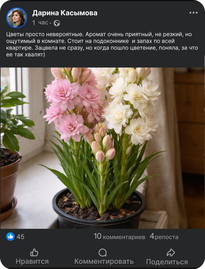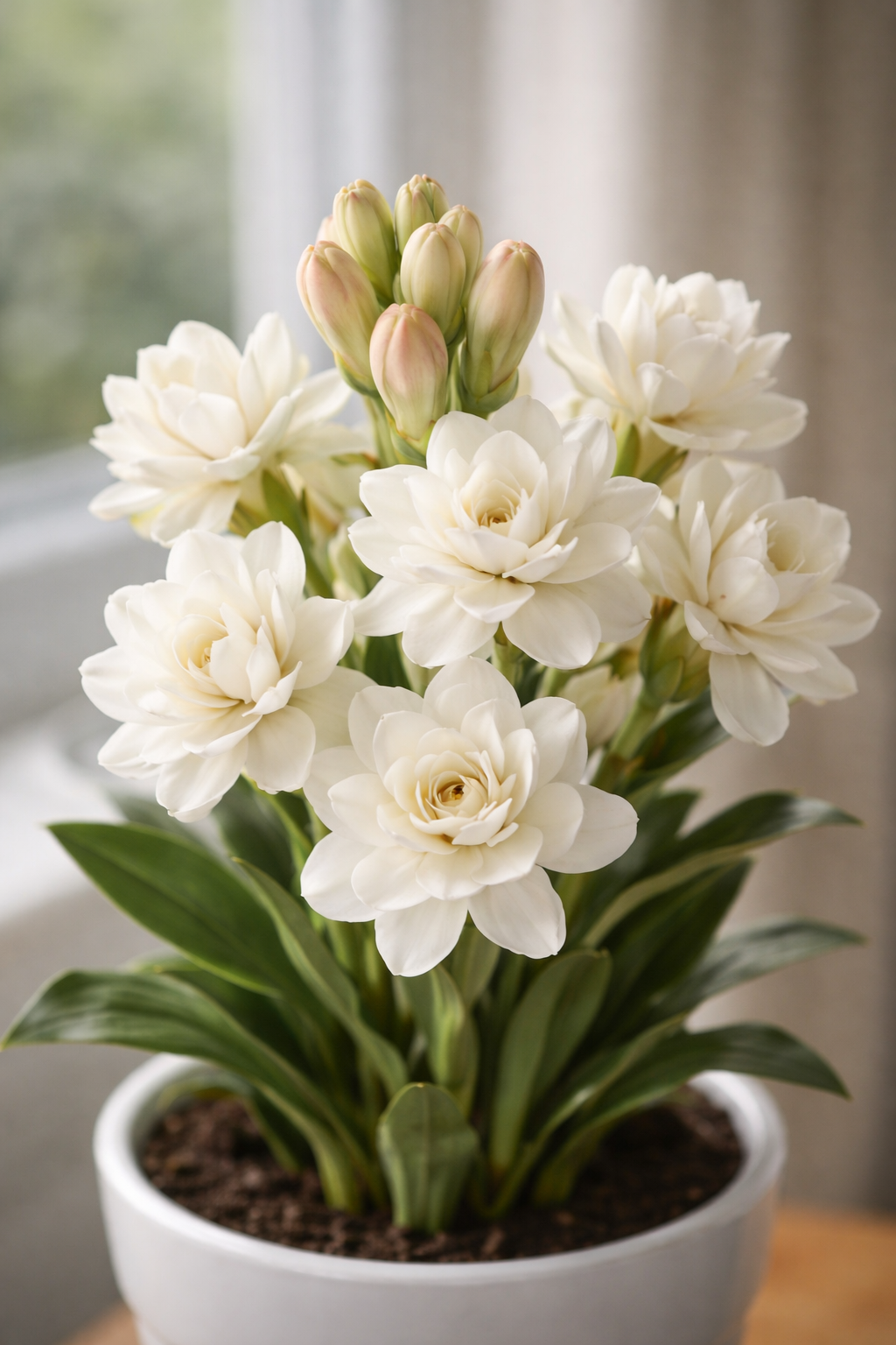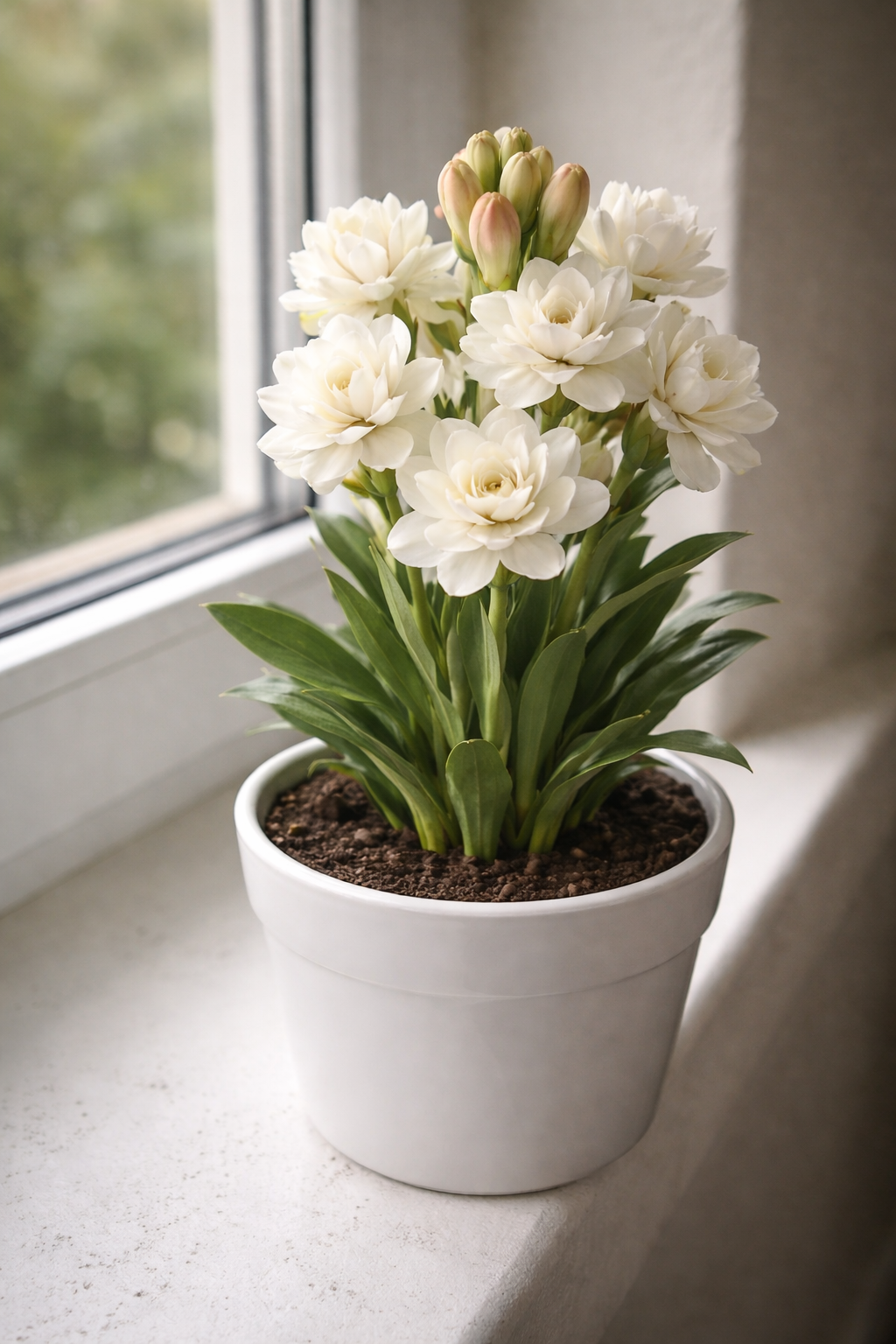 Растение простое в выращивании: любит светлое место, умеренный полив и обычный грунт. После комнатного выращивания туберозу можно пересадить в открытый грунт, где она продолжит расти как садовое растение. Это делает ее не одноразовой покупкой, а полноценным цветком на годы вперед.