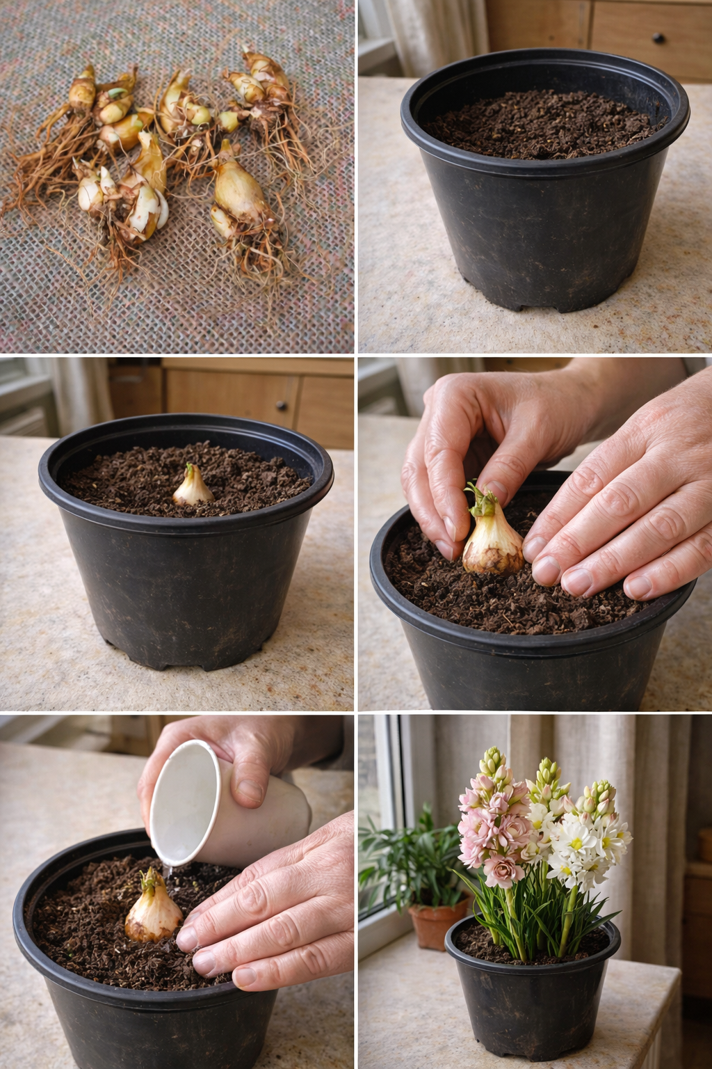 Для посадки туберозы подойдет обычный горшок с отверстиями и легкий питательный грунт. Луковицу сажают так, чтобы верхняя часть оставалась над поверхностью почвы — не закапывать полностью. После посадки почву слегка уплотняют и поливают умеренно, без перелива. Горшок ставят в светлое место, желательно на подоконник.