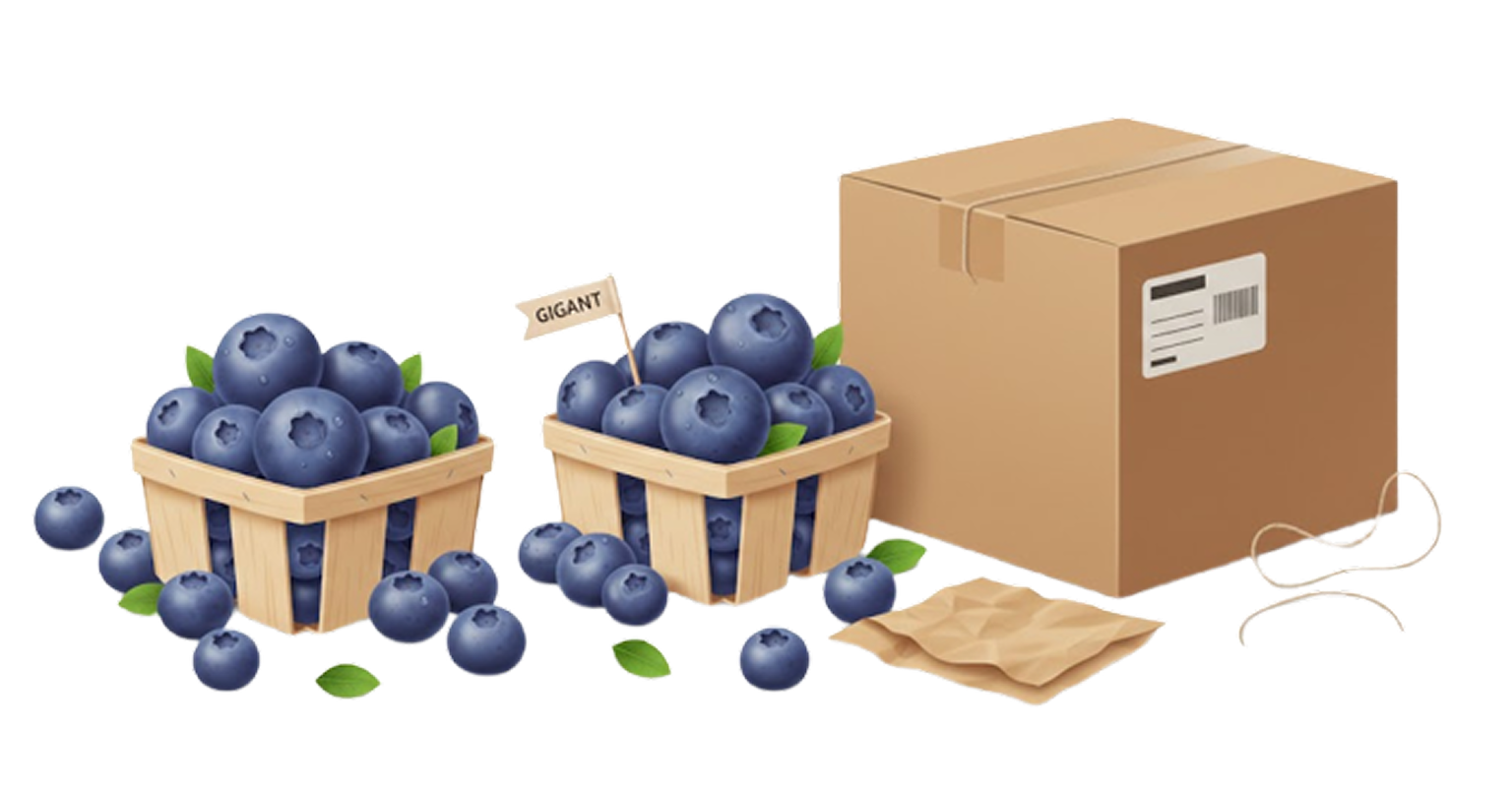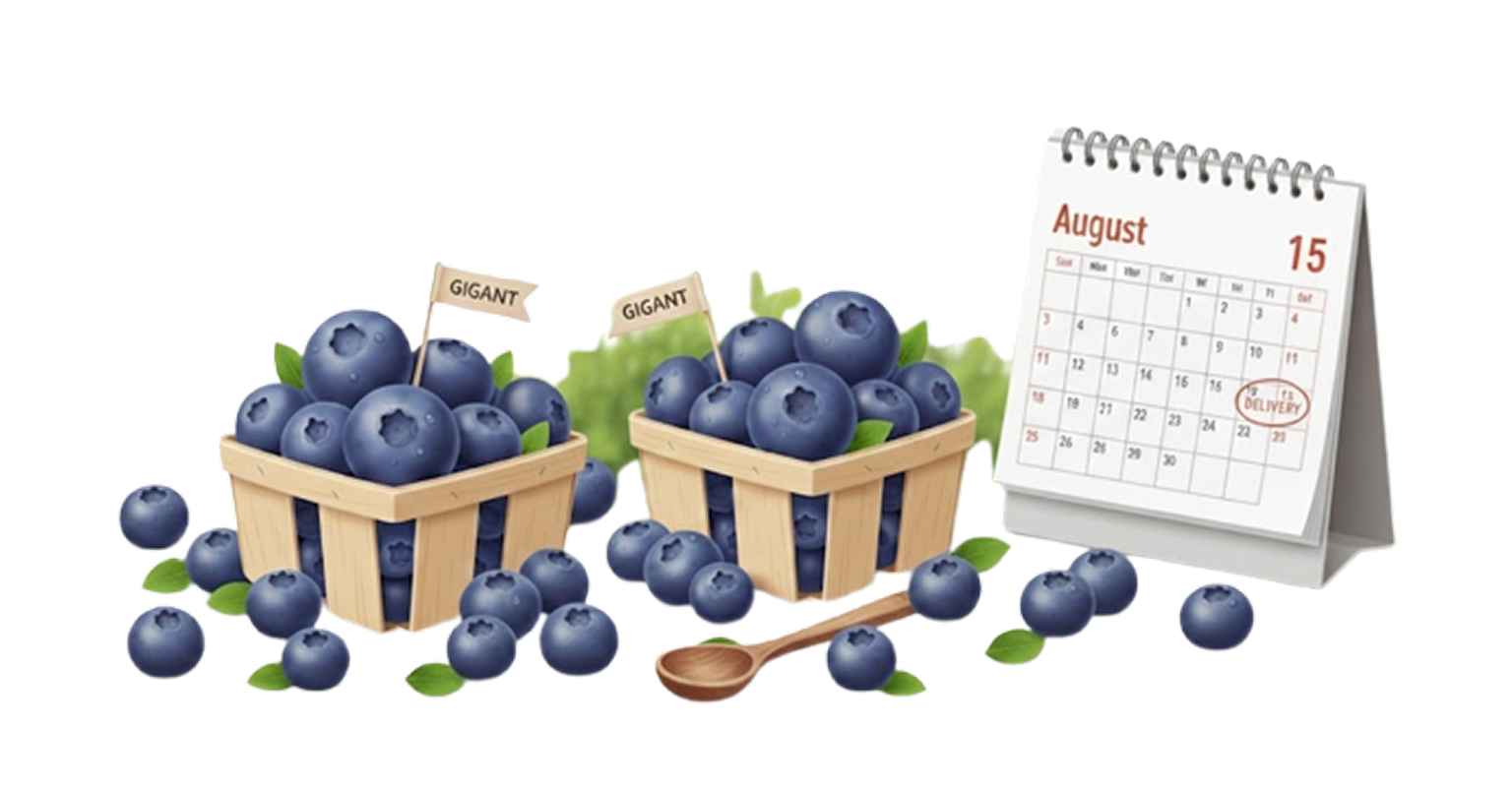 «Blue Gigant» — современный высокоурожайный сорт голубики с очень крупными, плотными и сладкими ягодами. Ягоды ароматные, с приятным балансом сладости и лёгкой кислинки. Отлично хранятся и хорошо переносят транспортировку.