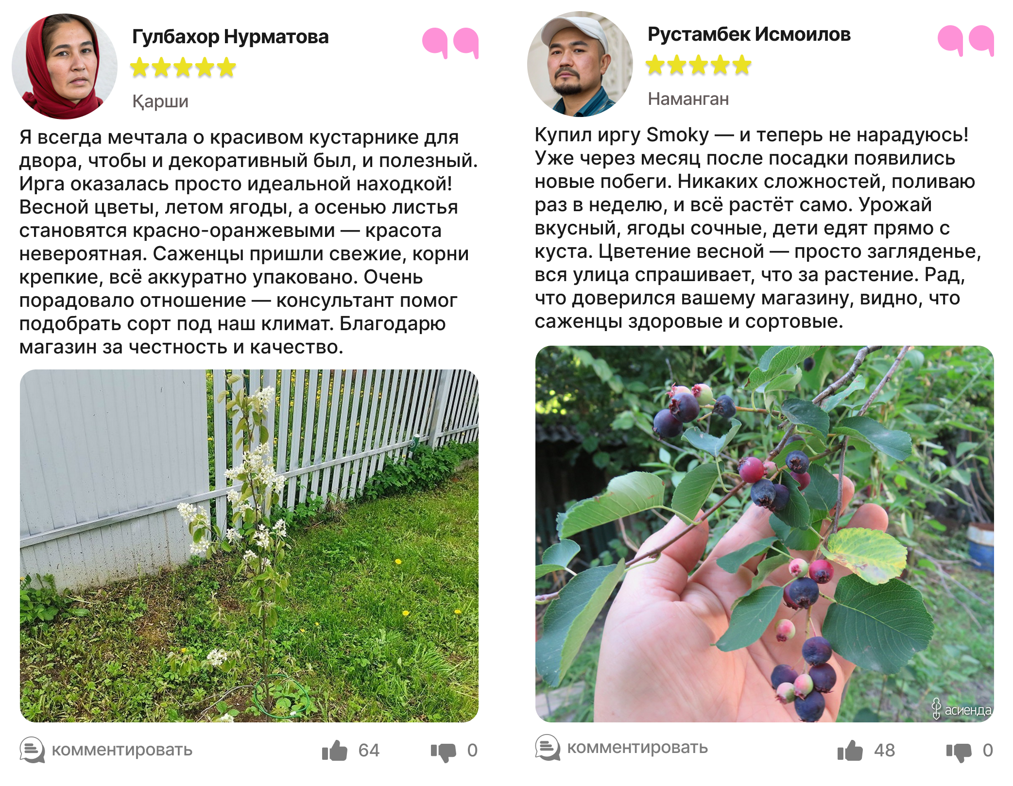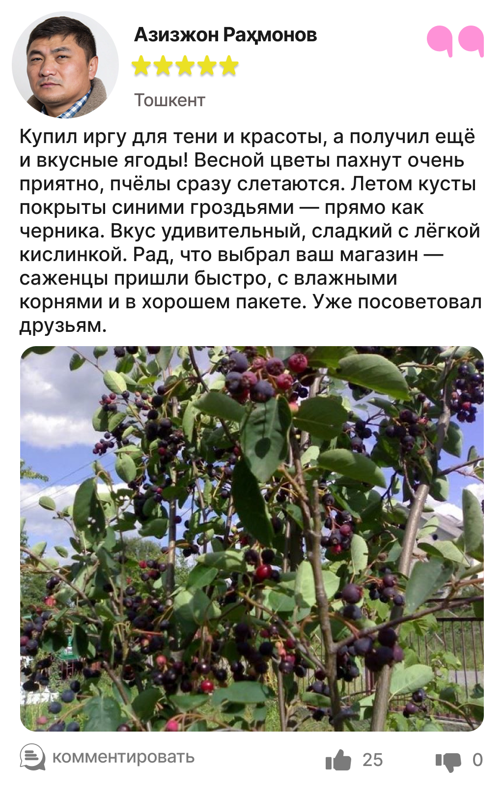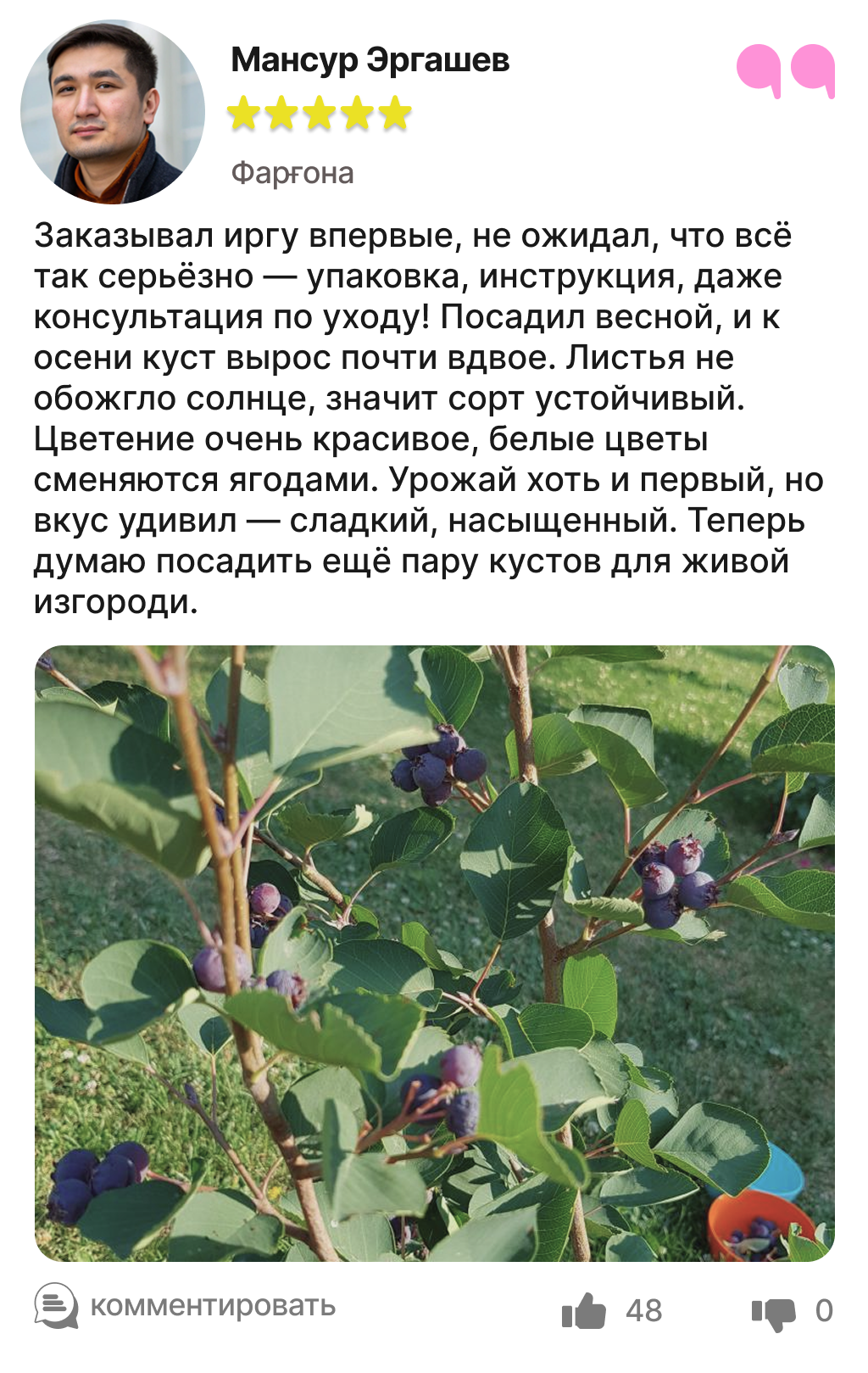 Харидорларимиз сотиб олинган ва етиштирилган ирга кўчатлари ҳақидаги таассуротлари билан ўртоқлашмоқда.
