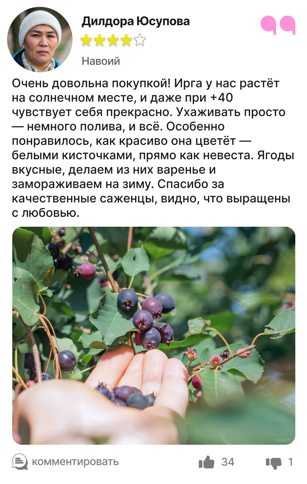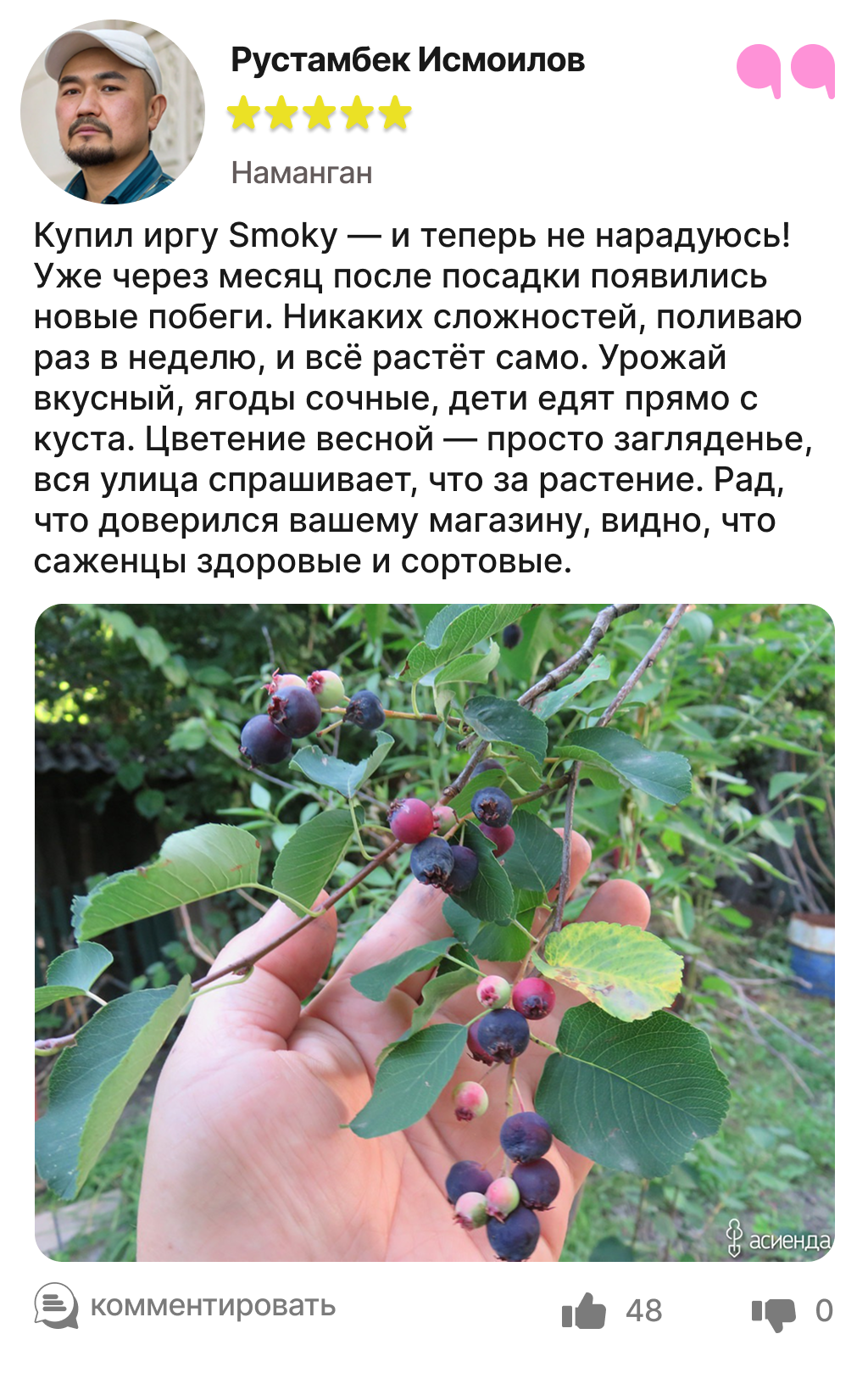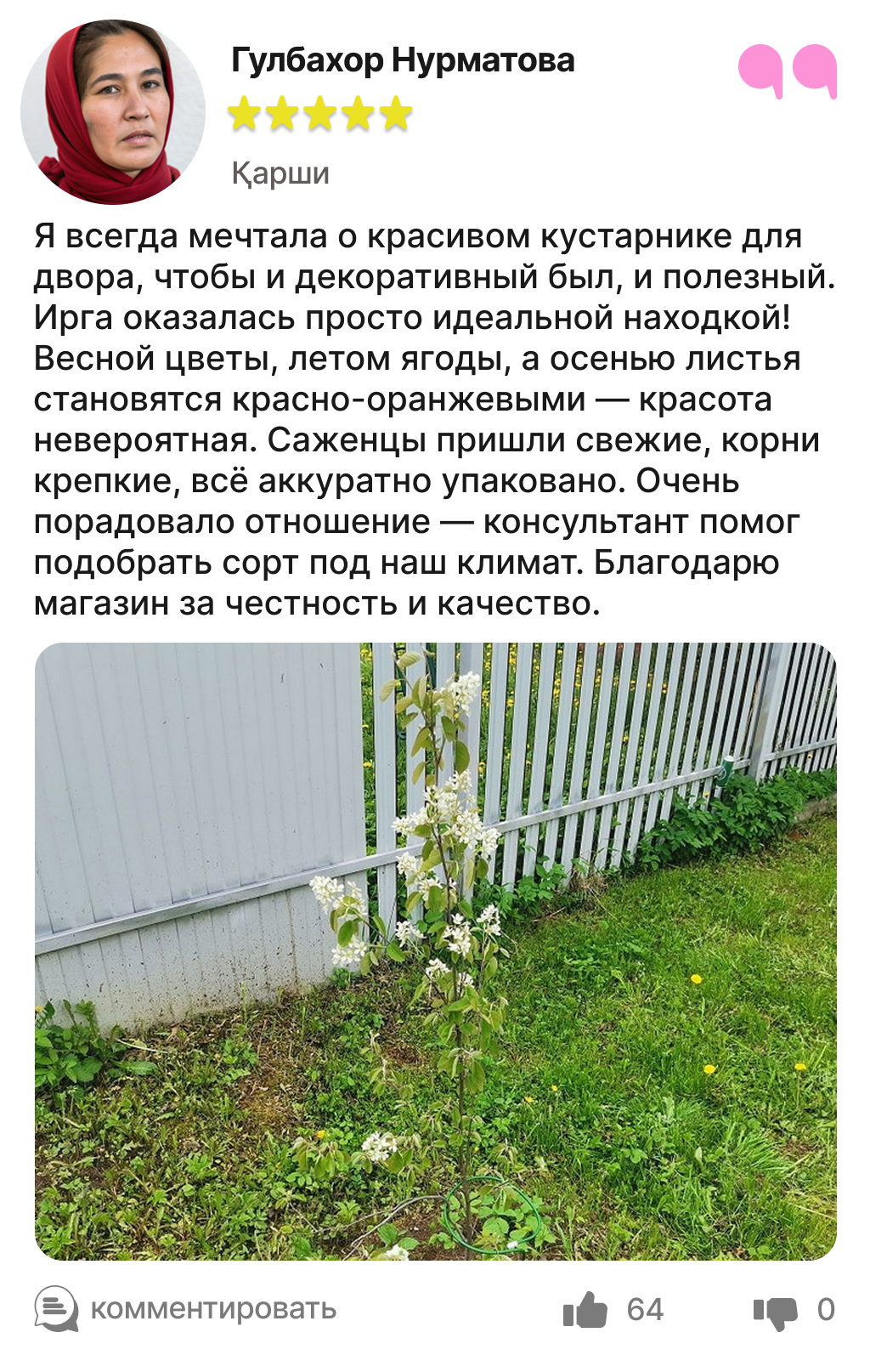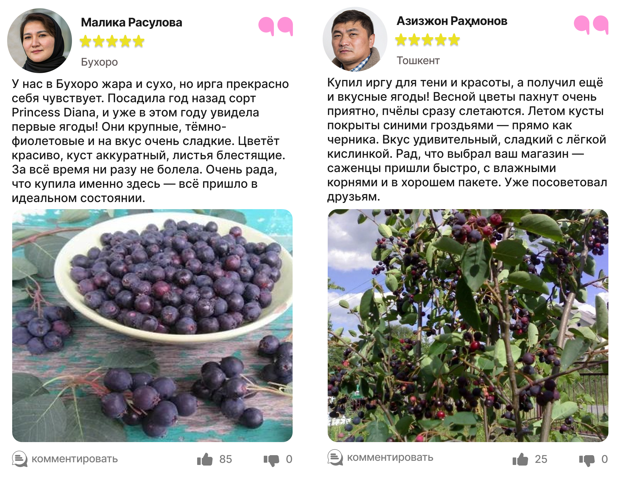Харидорларимиз сотиб олинган ва етиштирилган ирга кўчатлари ҳақидаги таассуротлари билан ўртоқлашмоқда.