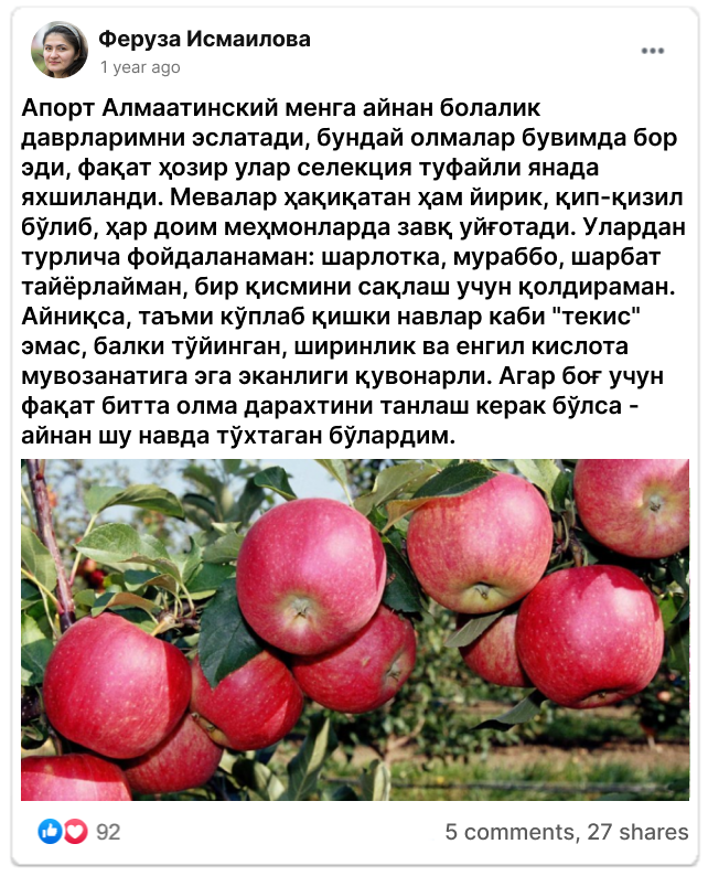 "Апорт Алматинский" - Ўзбекистон селекционерлари томонидан яратилган олма афсонасининг қайта жонланиши