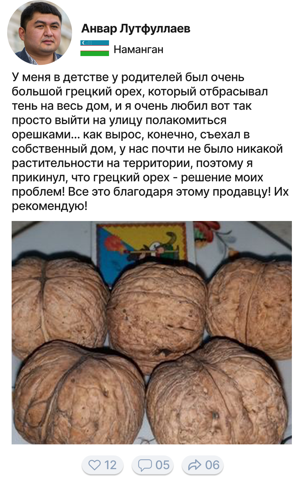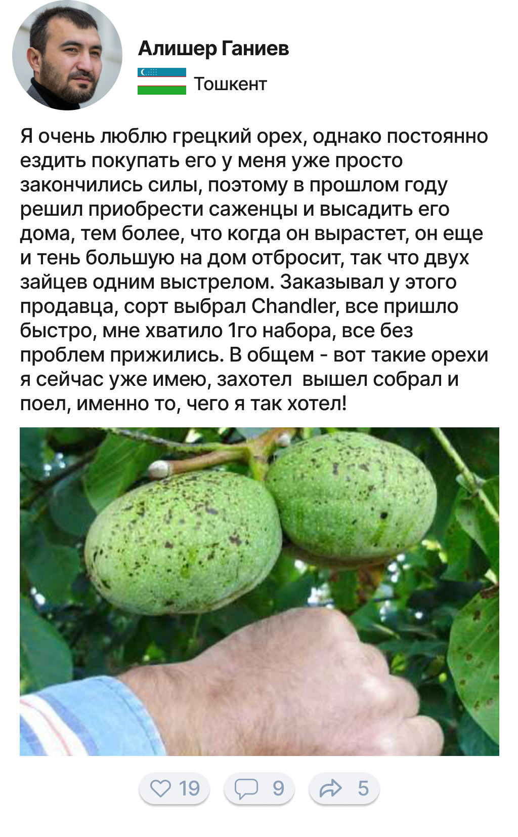 Ёнғоқ жуда қимматбаҳо дарахт тури бўлиб, биз кўпинча оёғимиз остида нима ўсаётганини, қандай бойликка эга эканлигимизни тушунмаймиз. Ёнғоқ қимматбаҳо мебель ишлаб чиқаришда жуда кўп ишлатилади, ёнғоқ жуда чиройли ранг ва ёғоч тузилишига эга. Мен оилам билан 20 йилдан ортиқ вақтдан бери ёнғоқни сотиш учун етиштираман. 5 йил олдин биз мижозларимизга ёнғоқ кўчатларини сотишни бошладик ва ҳар сафар улар ўз ёнғоқ боғларини етиштиришга муваффақ бўлганларида хурсанд бўламиз!